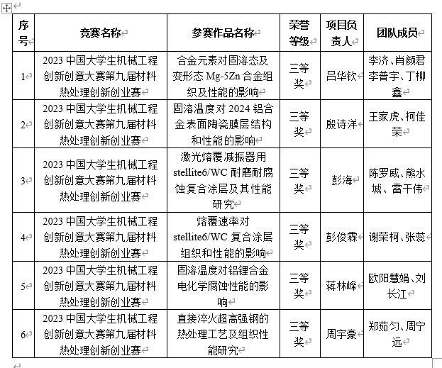 7月15~16日,公司学子殷诗洋、吕华钦、彭俊霖等六名同学组织的团队,在2023年中国老员工机械工程创新创业大赛材料热处理创新创业大赛中展现出了各自团队的风采,均荣获三等奖。为迎战此次比赛,公司组织了一支具有丰富比赛经验的教师队伍,从训练到比赛为员工进行了全程指导。获奖具体名单如下: