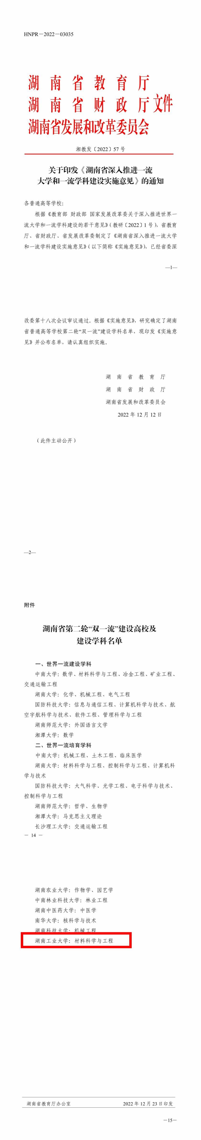 2022年12月26日,湖南省教育厅、财政厅、发展改革委联合公布了新一轮“双一流”建设高校和建设学科名单,除国家认定的15个“世界一流建设学科”外,我省12所高校21个学科入围“世界一流培育学科”名单。其中,威廉希尔“材料科学与工程”学科成功入选。