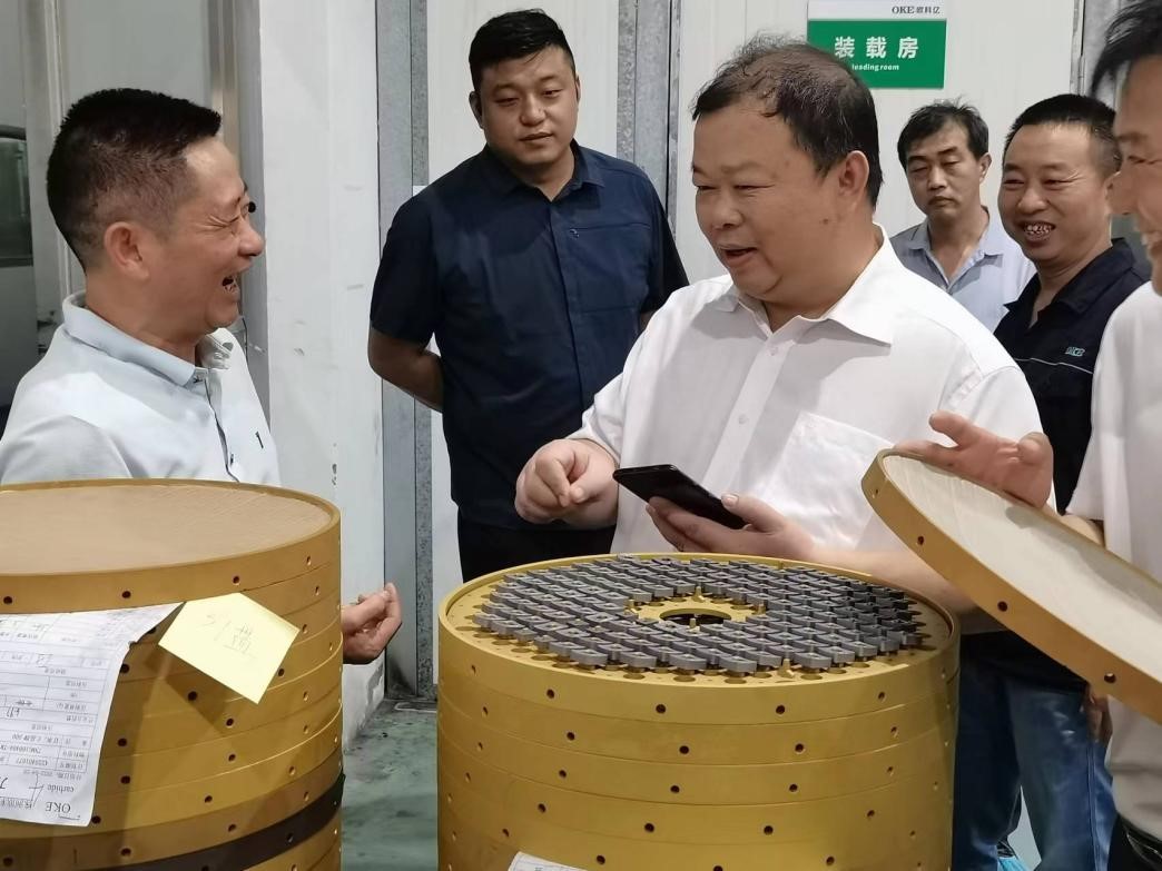 欧科亿董事长袁美和对刘望书记一行的到访表示了热烈欢迎,并陪同参观了公司的数控生产车间。刘望书记对于欧科亿公司的先进智能制造体系以及自动化生产车间给予了充分肯定。