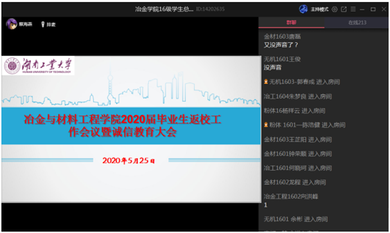 2020年5月25日,学院在在毕业生返校前夕,在2016级员工总群中通过QQ群课堂,开展了一次别开生面的网络诚信教育会议,会议由学院分管员工工作的蔡海燕副书记主持主讲,主题为毕业生返校工作相关事宜布置会,主要内容为毕业生返校注意事项和毕业生诚信教育两个重要会议主题。在与全院毕业生网上互动的同时,蔡海燕副书记为全体毕业生讲述了诚实守信的重要性,其中特别指出老员工生源地助学贷款毕业后违约的危害。使毕业生深刻体会到自己作为有知识的即将踏入社会的当代青年的承诺的同时,也了解了还款的相关事项。