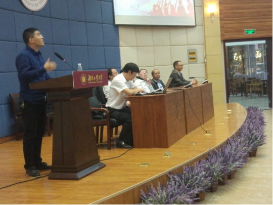 接着,教师代表蹇海根博士发言,他鼓励同学们进入大学后要重新思考自己的梦想,刻苦钻研,学会解决问题,在学习之余强健体魄,并希望同学们能够处理好“为学为人”的关系,做到“严谨为学,诚信为人”,努力塑造健全人格。