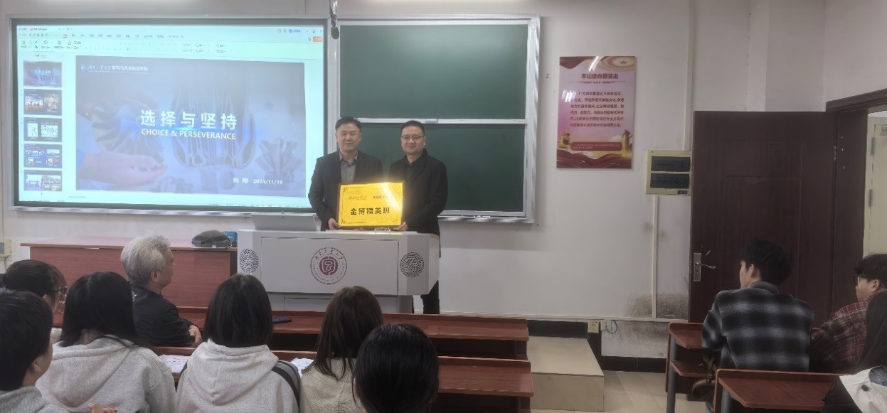 11月19日下午,湖南金博高新科技产业集团有限公司与公司共建“金博精英班”授牌在冶金楼301教室隆重举行,湖南碳康生物科技有限公司总经理张翔、经理范才河、党委书记李永清、副经理何世文等出席仪式,粉体材料2301班全体员工参加了仪式。