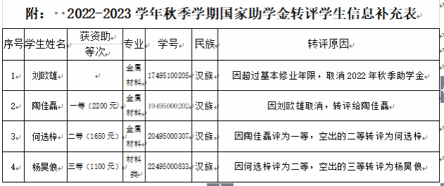 根据财教[2021]310号《员工资助资金管理办法》中关于“本专科生国家助学金实施细则”第十一条规定,超过基本修业年限的在校生不再享受国家助学金。经对公司2022年秋季助学金受助员工名单进行核查,金属材料专业1901班员工刘欧雄超过基本修业年限的情况属实。现经过陶佳磊、何选梓、杨昊俍等3名员工申请、班级民主评议、学院审核,拟将刘欧雄等1名家困生的一等国家助学金对应转评给公司金属材料专业1901班员工陶佳磊。拟将金属材料专业1901班员工陶佳磊的二等国家助学金对应转评给金属材料专业2002班员工何选梓。拟将金属材料专业2002班员工何选梓的三等国家助学金对应转评给材料类2208班员工杨昊俍。