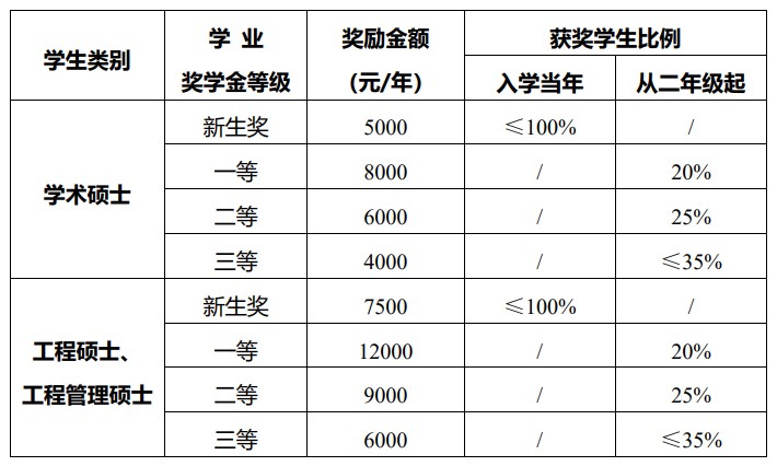 为资助员工顺利完成学业,学校根据国家相关文件精神设立了国家奖学金、助学金、学业奖学金、研究生三助岗位等多元化奖助体系。硕士研究生学业奖学金拟设置标准如下:
