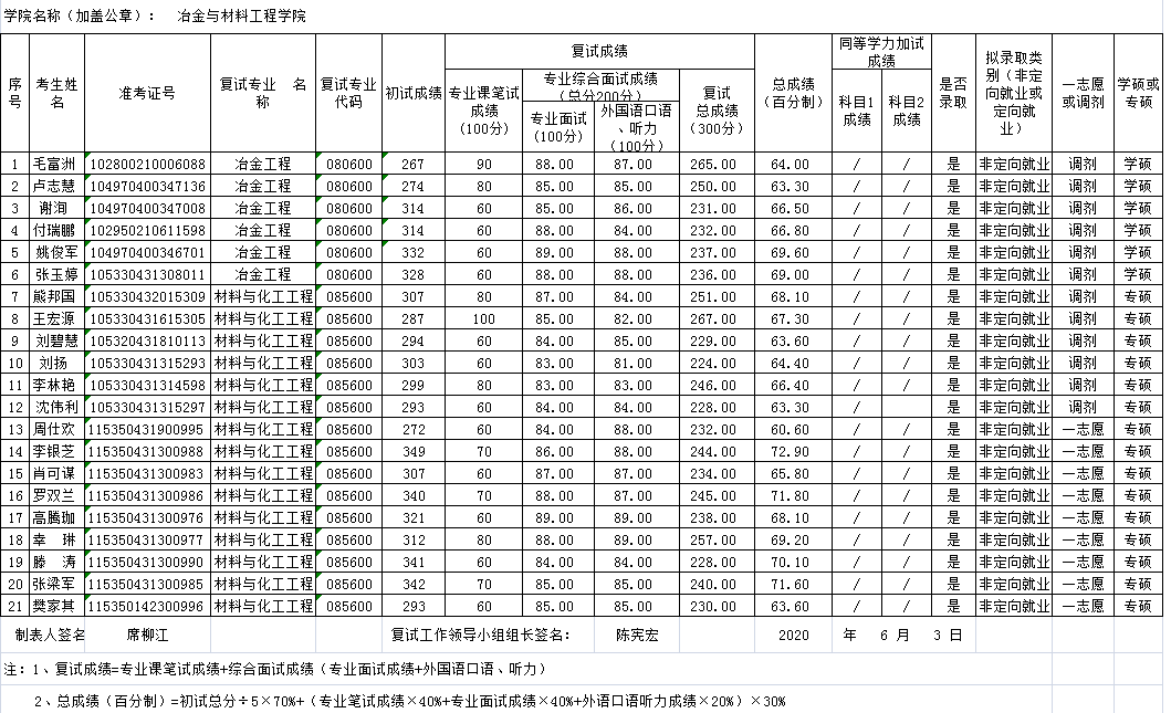 公司2020年招收攻读硕士学位研究生拟录取结果
