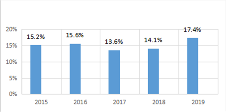 毕业生升学深造比例继续保持较高水平。公司2019届毕业生报名参加研究生考试的报考率为33%,共有67人被中科院、中南大学等国内知名院校录取,占毕业生总数的17.4%,较往年有提高,也远高于全校平均水平。以下为公司近五年来考研率状况:
