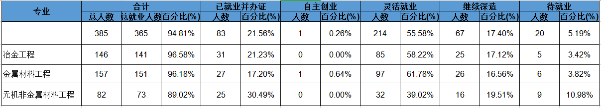 冶金与材料工程学院2019届本科毕业生共有385人,其中冶金工程专业146人,金属材料工程专业有156人,无机非金属材料工程专业82人。今年公司毕业生就业主要特点包括:整体就业率较去年有大幅提升;就业单位流向以企业为主,面向大型国有企业等重点单位就业的比例持续增加;深造比例继续保持较高水平,具体情况如下:
