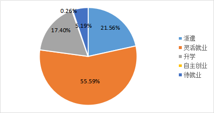 从单位性质分布来看, 2019届毕业生面向大型国有企业等重点单位就业的比例持续增加,占毕业生总数的21.56%,灵活就业的毕业生占55.6%;从行业分布来看,毕业生流向制造业的人数比例最高,为56.1%,其次是建筑业,占比6.2%。