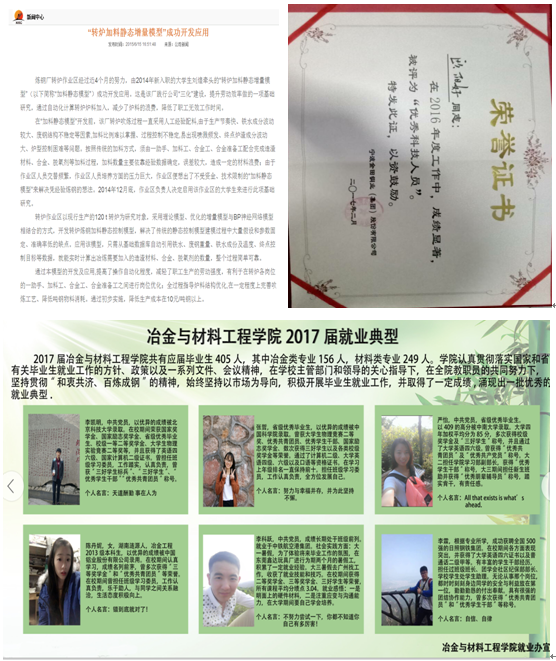 随着学院内培养员工素质,外拓展就业资源,公司的毕业生就业率一直稳定在90%以上并且就业质量稳步提升,例如2014届毕业生刘煌在阳春新钢成功开发“加料动态模型”,降低生产成本在10元/吨以上,产生巨大的经济效益。2015届毕业生欧阳好刻苦钻研,所研发成果获得宁波金田铜业集团的二等奖,被授予优秀科技人员。2017届毕业生严怡以409分被中南大学录取。