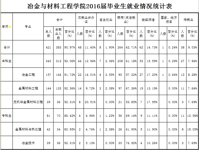 冶金与材料工程学院2016届毕业生就业情况统计表