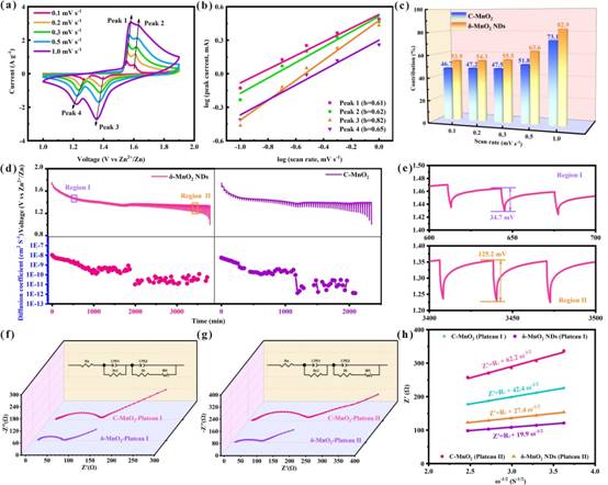 图2 δ-MnO2 NDs和C-MnO2电极在锌离子电池中的电化学动力学分析