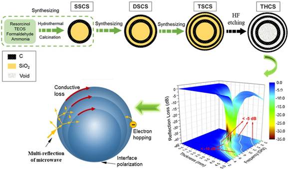 该工作采用水热法、煅烧法和刻蚀法制备合成了单壳层和多壳层的实心/空心碳亚微球,并首次将其作为吸收剂应用于吸波材料中。空心碳亚微球的复合介电常数和切线损耗有了较大的改善,这主要归因于其独特的中空结构。不仅如此,与单壳层碳亚微球相比,多壳层碳亚微球具有更多的微波多重散射效应和更强的导电损耗,这来源于极化增强所提高的介电损耗能力。在此基础上,将三壳层中空碳亚微球作为吸收剂应用于吸波材料中,所制备复合材料的最佳反射损耗(RL)达到-48.5 dB,具有较宽的有效吸收带宽(RL<-10dB),这表明多壳层中空碳亚微球是一种很有前途的高性能微波吸收剂。