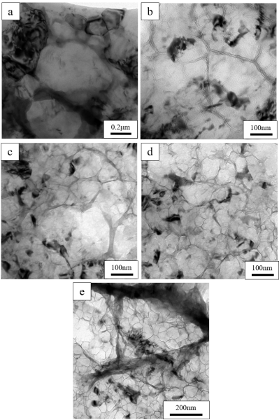 TEM images of samples with different passes of rapid cold punching and recrystallization annealing