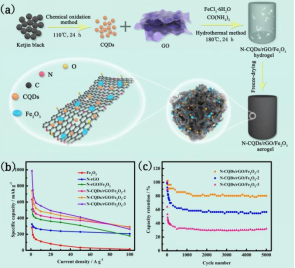 (a)N-CQDs/rGO/Fe2O3复合气凝胶的形成过程图,所制备样品的(b)倍率性能和(c)循环性能图