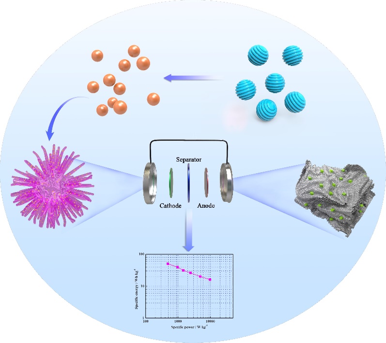 CQDs作为一种尺寸小于10 nm的新型零维碳材料,由于其具有独特的量子尺寸效应、表面效应和介电限域效应等优点,近年来在储能领域的应用逐渐引起了研究者的关注。该工作首先采用混酸强化学氧化法回流合成路径制备得到了石墨化的CQDs,其产量高达50%以上,并进一步利用其作为结构导向剂和导电剂一步原位水热法制备得到氮硫共掺杂石墨化CQDs修饰的纳米杆组装成的海胆状NiCo2S4微米球复合正极材料。与纯的NiCo2S4相比,该复合正极材料表现出增强的比容量、倍率性能和循环稳定性,这优异的电化学性能可归因于具有电容特性的高导电性N, S-CQDs与具有法拉第特性的高容量NiCo2S4之间的协同效应。在此基础上,以其作为正极,N-rGO/Fe2O3作为负极,组装成新型水系碱性混合储能器件,实现了较高的比能量(50.2 Wh kg−1)、高的比功率(9.7 kW kg−1)和优异的循环稳定性。该工作为电池/电容型复合材料同时被利用作为正极和负极的高性能碱性水系储能器件的设计和开发提供了有价值的指导。