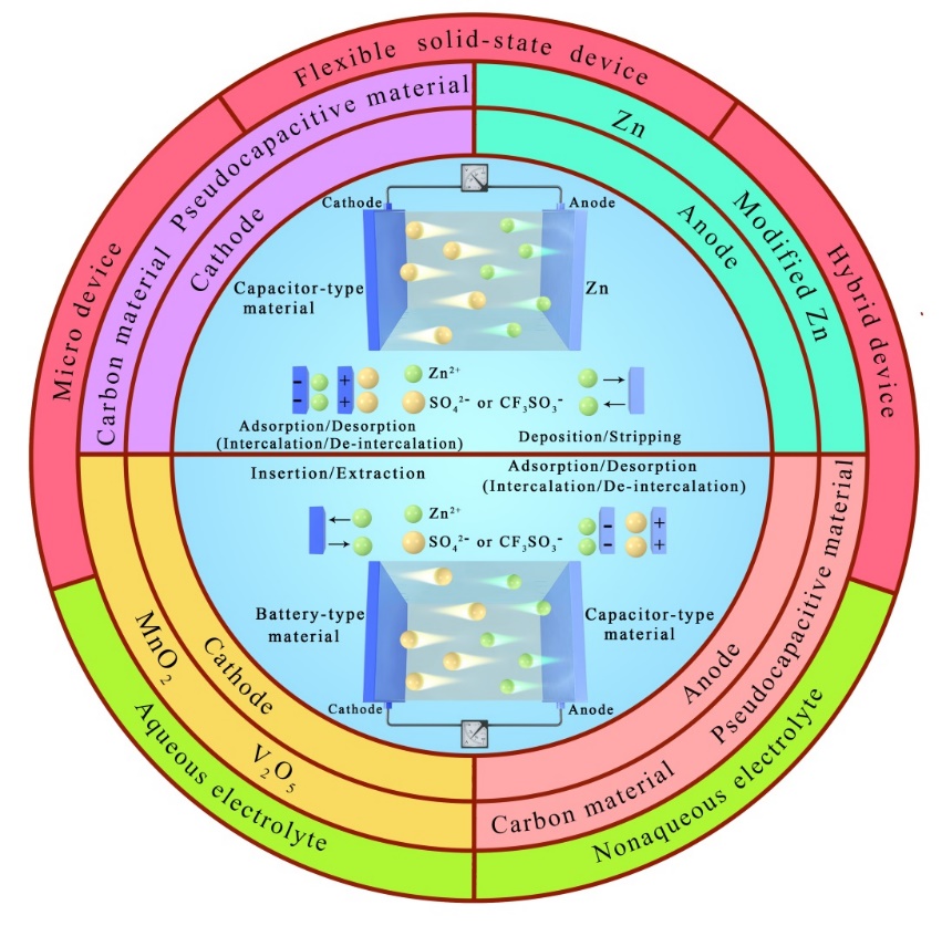近年来,随着环境的日益恶化和不断增长的能源需求,电化学储能器件得到了研究者的广泛关注和研究。其中,锌离子混合电容器因其具有锌离子电池的高能量密度、超级电容器的高功率密度和优异循环稳定性,以及资源丰富、无毒性和高安全性等诸多优点,有望成为电化学储能器件中最有潜力的候选之一。该论文首先介绍了锌离子混合电容器的基本要素,包括其组成、储能机理和优缺点。其次,他们详细地总结了锌离子混合电容器的研究进展,包括其电极材料(电容型材料、电池型材料),电解液(水系电解液、非水系电解液)和新型器件(柔性固态器件、微型器件、混合器件)。最后,他们提出了锌离子混合电容器目前所面临的问题和挑战,并提出了未来的研究方向。该综述为未来高性能锌离子混合电容器及其关键材料的设计和开发提供有益的指导。