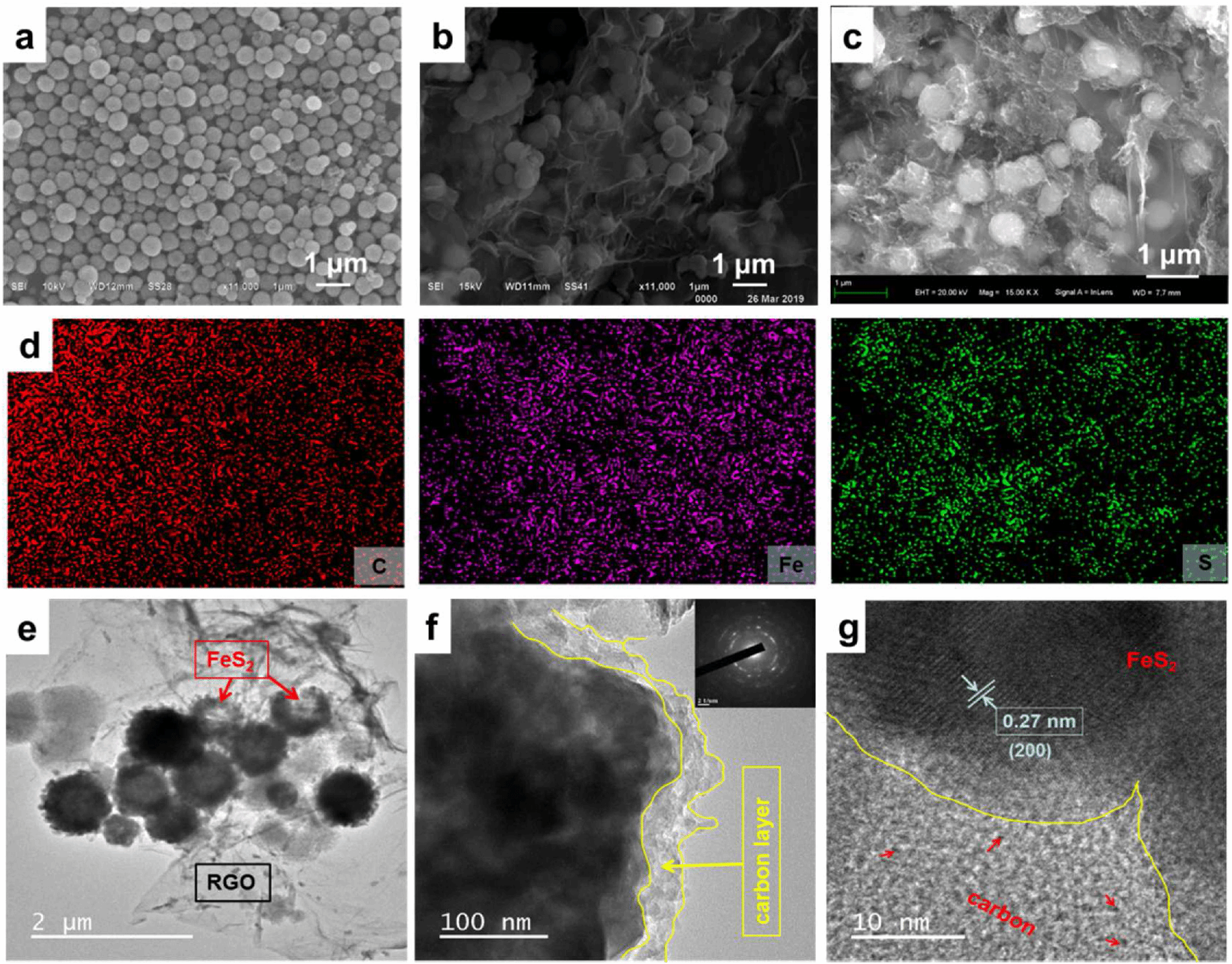SEM images of the FeS2@C (a), FeS2@C/RGO (b) and FeS2@C/HRGO (c),EDS mapping images (d) TEM image (e), HRTEM images (f, g) and SAED pattern (f inset) of the FeS2@C/HRGO