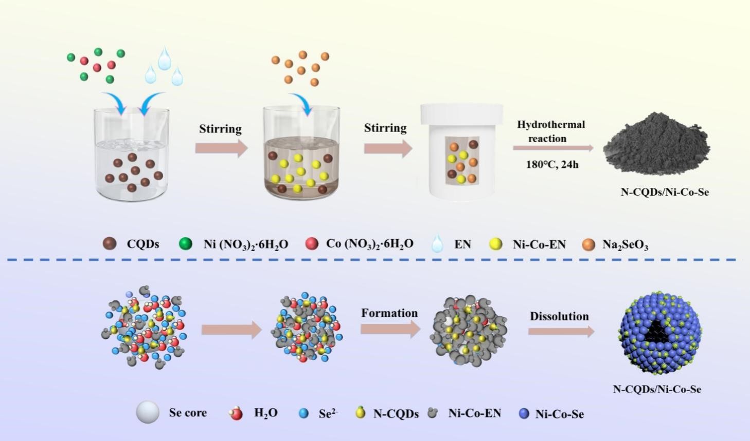 图 N-CQDs/Ni-Co-Se中空微球复合材料形成过程示意图