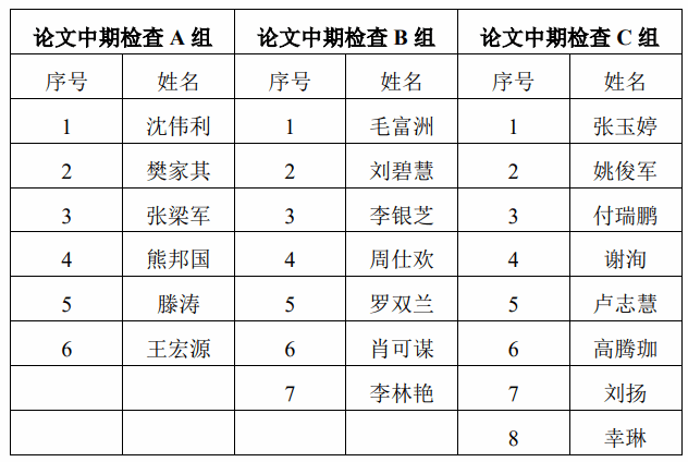 根据公司2020级硕士研究生研究方向特点,学院成立三个学位论文中期检查小组,每个小组由3-5名研究生导师或副高级及以上专家组成,设组长1名、秘书1名。可根据实际情况聘请相关学科及外校研究生导师参加,但组长必须为本院研究生导师。具体安排如下: