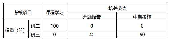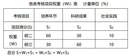 研究生“培养环节”、“科研成果”和“社会实践”三个考核项目计分权重如下表所示。