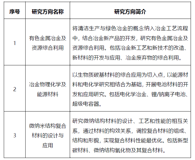 经过几十年的传承与发展,本学科为冶金与材料领域培养了一大批高层次人才。形成了“有色金属冶金及资源综合利用”、“冶金物理化学及能源材料”、“微纳米结构复合材料的设计与应用”三个相对稳定的学科研究方向。