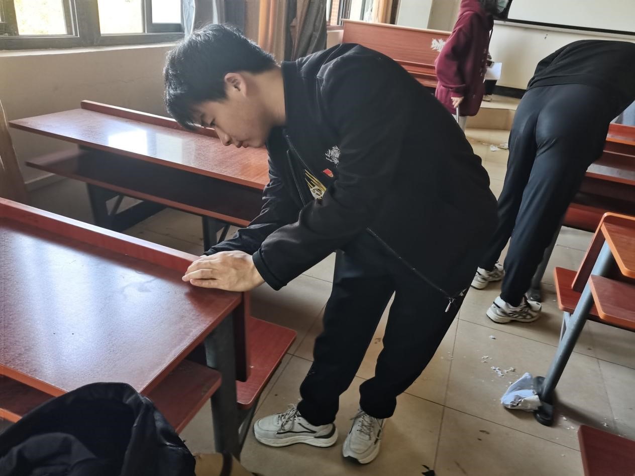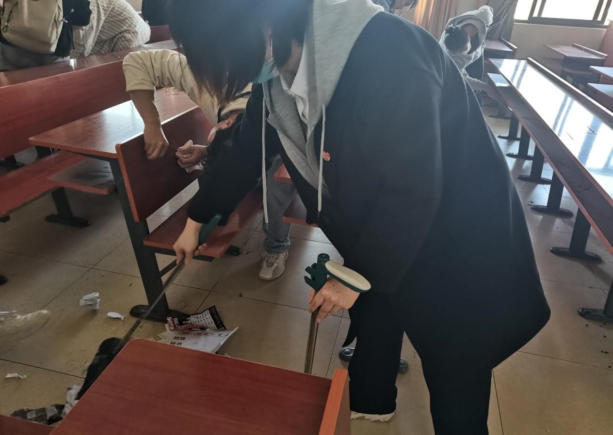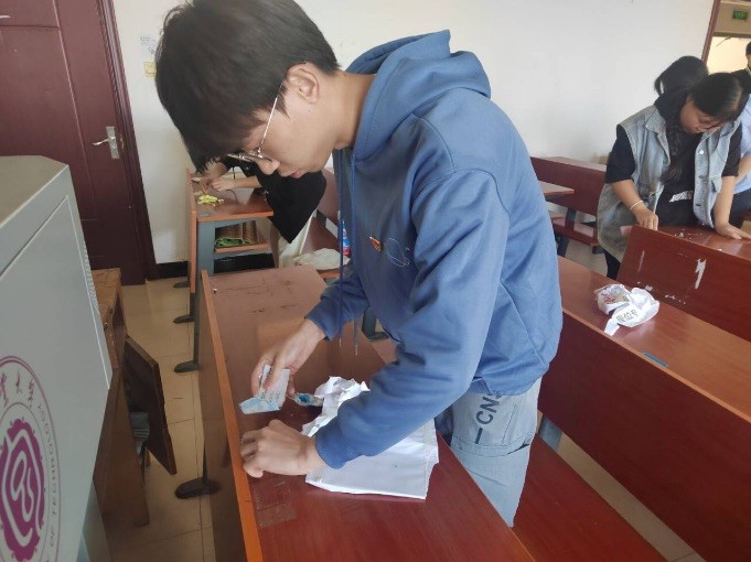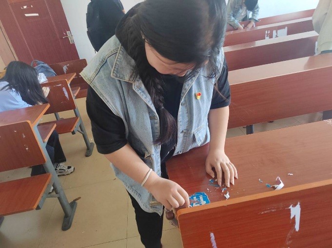 党员们兵分六组,带领积极分子对学院楼教室的广告贴纸、纸屑垃圾等进行清扫。大家仔细检查教室门板、墙面、地上甚至是桌案内部,用铲子、刷子等工具努力清洁乱涂乱画的痕迹、粘贴牢固的广告贴纸,有条不紊地进行着。经过一个下午的努力,整个教学楼教室主要区域及卫生死角都焕然一新。