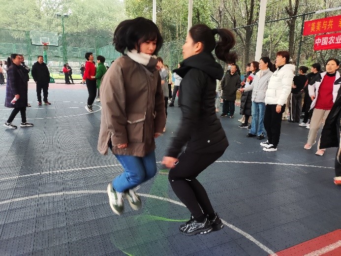 跳绳比赛项目包括集体接力跳绳和女职工两人一分钟跳。公司派出12名队员参加集体接力跳绳。两名摇绳的男队员节奏稳定,跳绳队员个个身轻如燕,动作敏捷。双人比赛中,3组女队员参加了比赛。随着跳绳在空中飞舞,女队员们动作灵巧,配合默契。