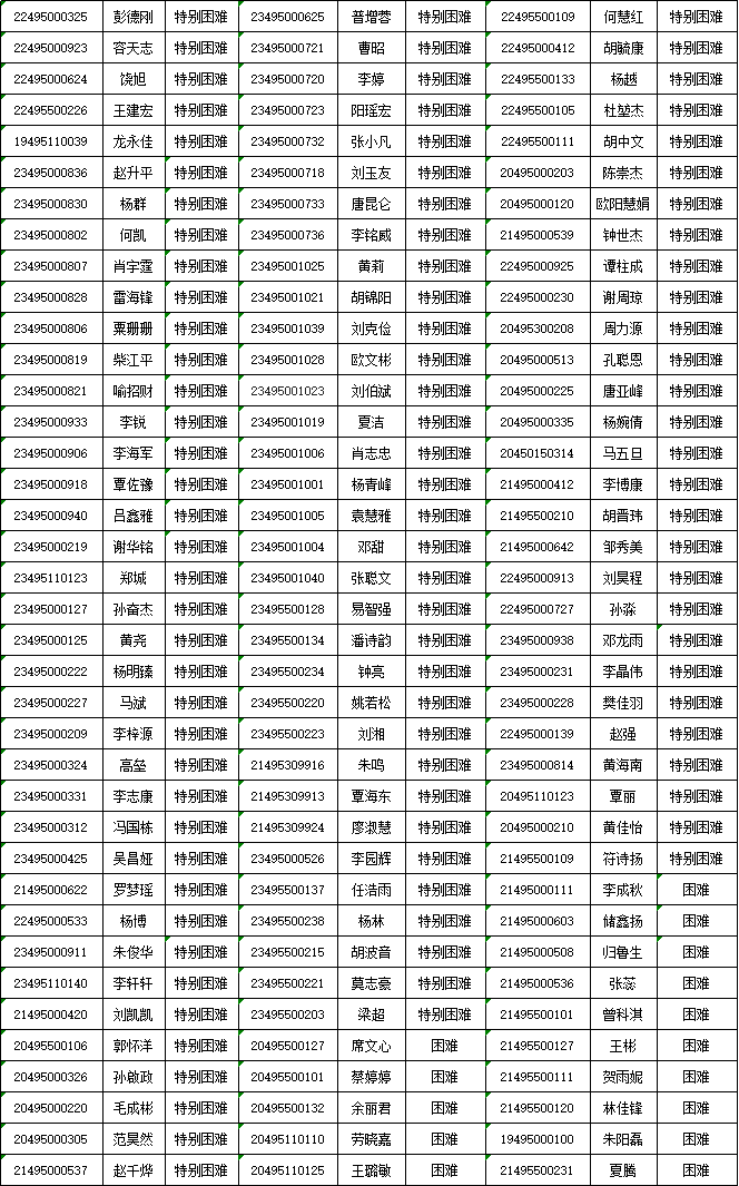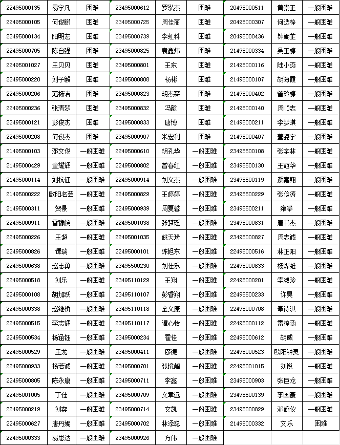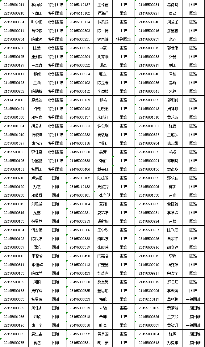 根据《威廉希尔家庭经济困难员工认定办法》和学校关于2023-2024年家困生认定相关通知,经由个人申请,班级民主评议,学院审核,共计422名员工拟定为2023年秋季威廉希尔家困生,名单及认定困难等级如下: