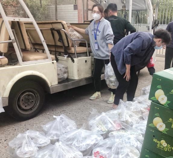 公司学工办主任陈勇,最关心的是员工的生活保障,解决员工困难被他视为义不容辞的责任。为保障员工能够吃好吃饱,陈老师兼职做起了“货拉拉司机”为同学们运送物资。水果、方便面、牛奶、八宝粥、面包等物资的搬运分发,陈老师坚持亲力亲为。他说:“看到同学们拿到物资后的笑容,一切付出都值了。”