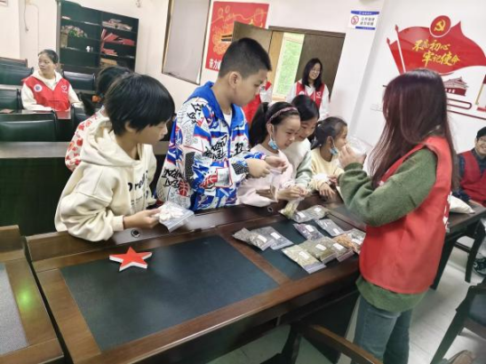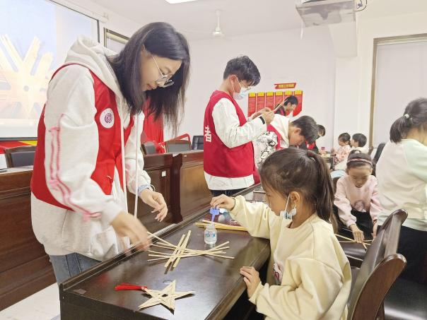 香包制作环节,志愿者们耐心地讲解着中草药的名字和功效,引导小朋友们亲手将香料装进香包中。活动现场弥漫着中草药的香气,小朋友们享受着亲手制作香包的乐趣。随后,在志愿者的指导下,小朋友们亲自动手尝试竹编制作,从简单的六角星、三角形等形状入手,逐渐掌握了竹编的基本技法。漆扇制作现场,同学们挑选自己喜欢的扇子,大胆想象和创作扇面的颜色和图案,志愿者耐心地指导孩子们完成上色过程,现场气氛热烈而融洽,欢声笑语此起彼伏,画面温馨。