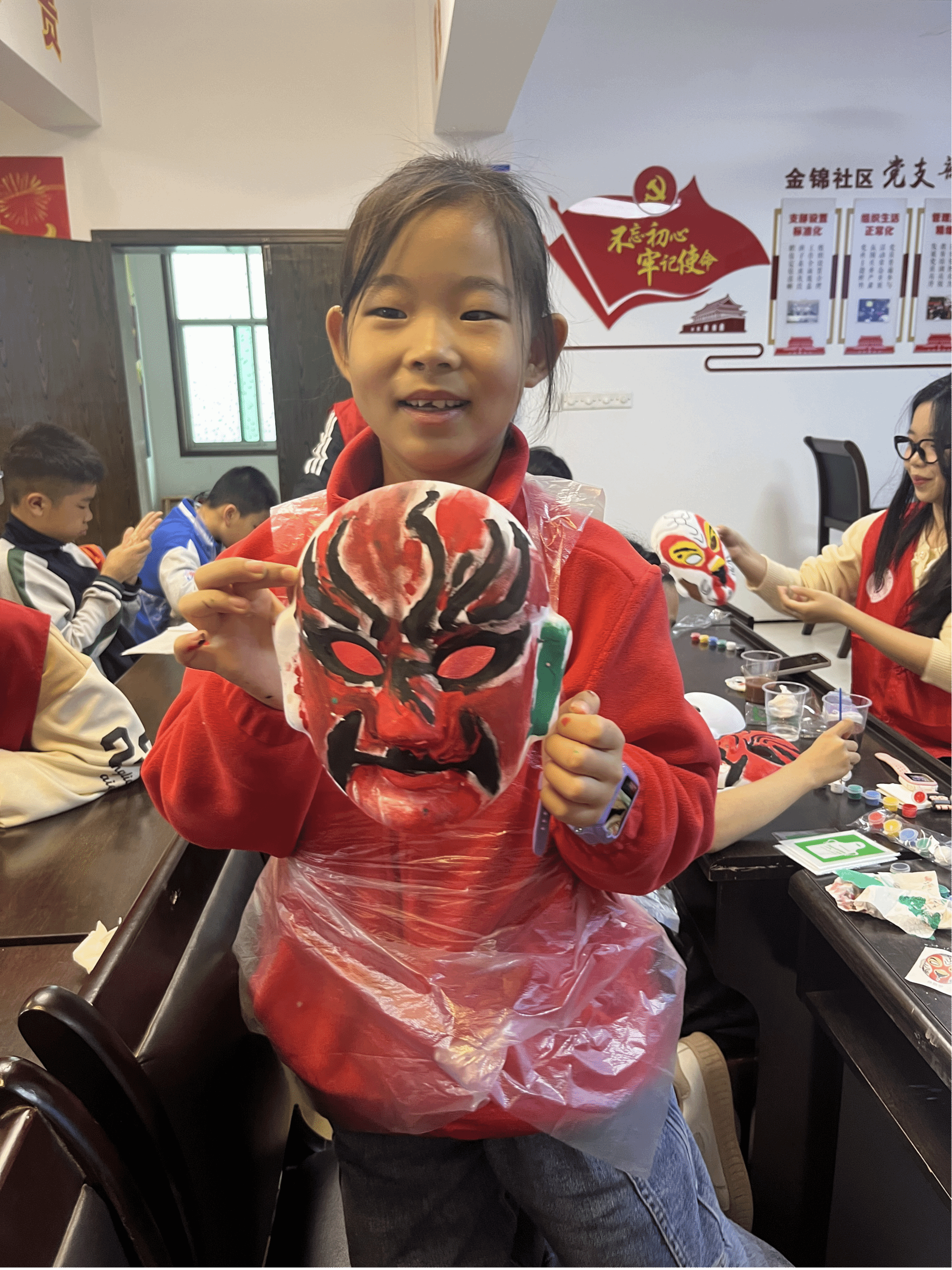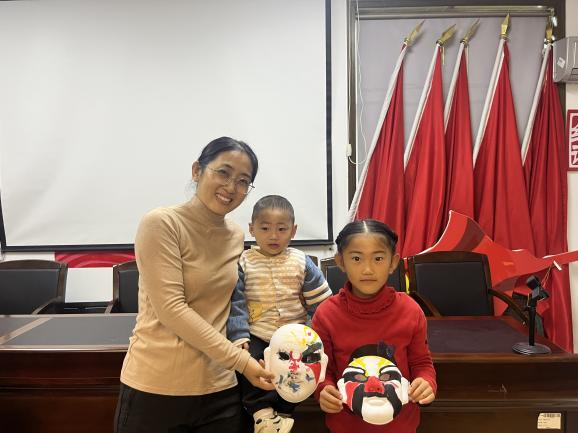 11月17日,金锦社区的活动中心被精心装饰,挂满了京剧脸谱和戏曲服饰的挂饰,入口处一张巨大的京剧脸谱背景板吸引了孩子们的目光,他们纷纷上前合影留念,为这场京剧之旅拉开了序幕。