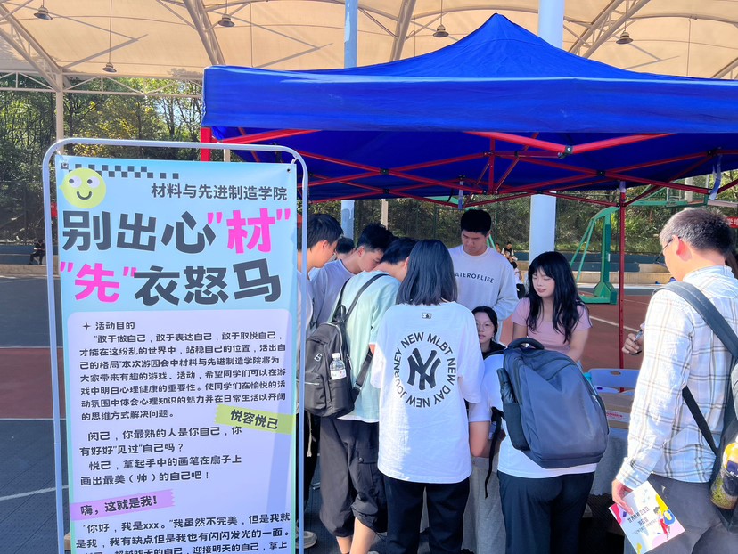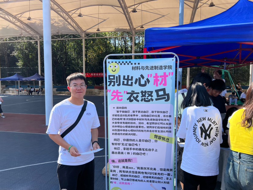 2023年10月17日下午,公司参与校心理健康教育中心在老冶金篮球场开展的“阅己悦己越己,成就更好自己”世界精神卫生日主题游园会活动。公司游园会主题为“别出心‘材’,“先”衣怒马”,活动准备了“悦容悦己”“嗨,这就是我”等小游戏,让同学们在游戏中轻松且快乐地学会正视自己、接纳自己。