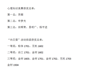 为鼓励同学们积极参加心理健康活动,表彰在“525”心理健康月系列活动中表现突出的同学们,2018年7月4日中午13:00,在新冶金楼311教室隆重举行了“525”心理健康系列月系列活动表彰大会,公司心理健康专干王采老师、各班心理健康委员和获奖同学参加了此次大会。