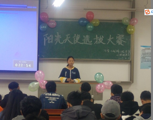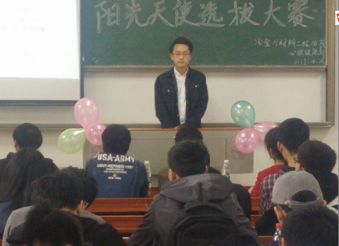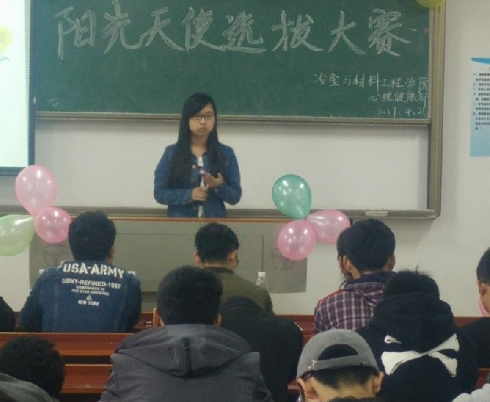 冶金与材料工程学院以“保持爱的浓度,孕育心的良善”为主题的“阳光天使”选拔赛在2017年4月21日在新冶金楼311教室隆重举行,学院心理专干王采老师、校心理部的主席和部长担任大赛的评委。