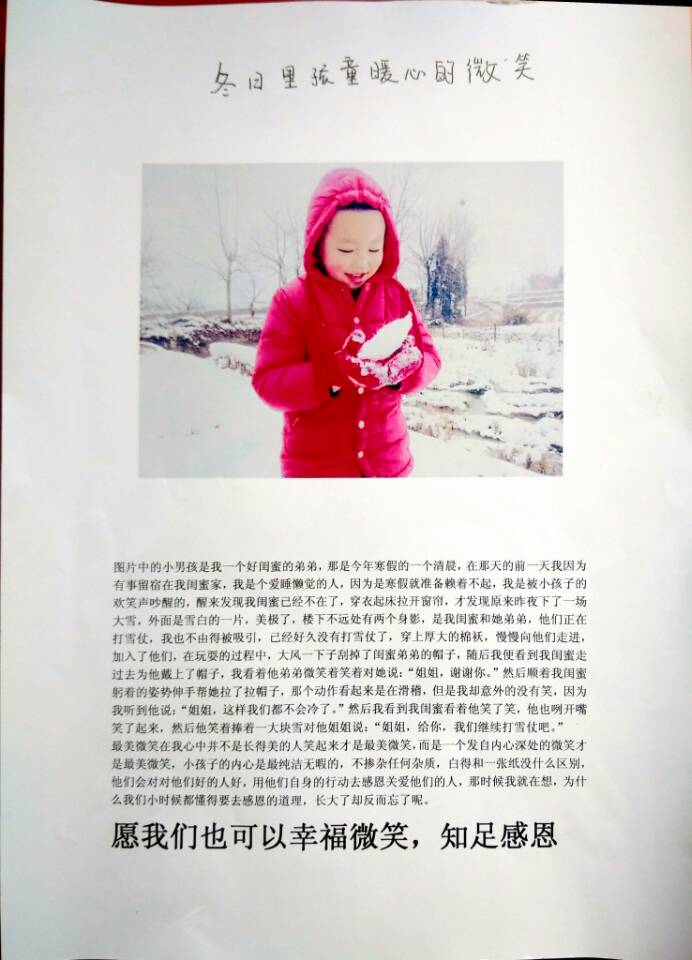 此活动开展有利于营造一个活泼健康、积极向上的氛围,丰富同学们的课余生活,培养同学们积极乐观的心态,向身边的人们传递正能量和微笑,让同学们了解更多知足感恩的故事,心中永存温暖和责任。