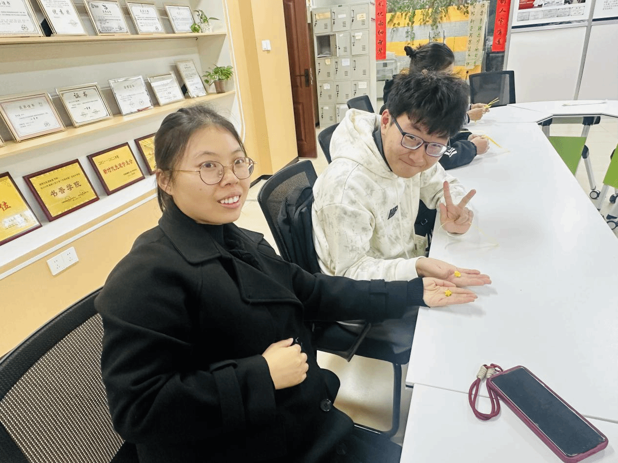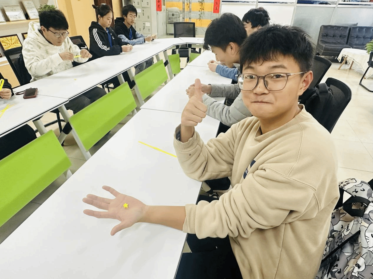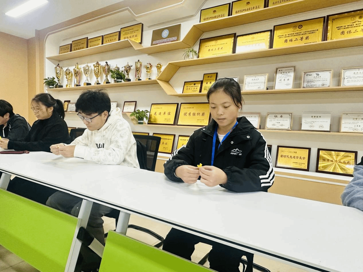 文珍珠老师亲切向同学们说明到,这将是一场关于创造与自我发现的美妙旅程。每一颗星星都将代表我们中的一个人,而折星星的过程,就是我们发现并展现自己闪光点的时候。随着文老师的示范,同学们纷纷拿起手中的彩纸,跟着她的步骤小心翼翼地折叠、翻转。团体辅导室内充满了纸张翻折的沙沙声和偶尔传来的笑声,每个人都沉浸在这份专注与创造的乐趣之中。