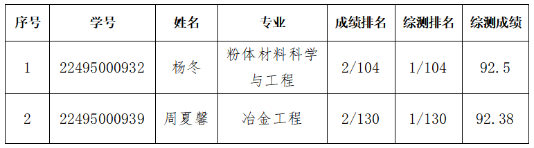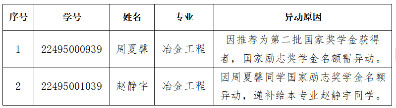经学院国家奖助学金评审小组对2022级冶金工程专业国家励志奖学金候选人进行评审和考察,根据讨论和研究意见一致同意将2022级冶金工程专业周夏馨同学的国家励志奖学金名额异动给本专业赵静宇同学,具体信息如下: