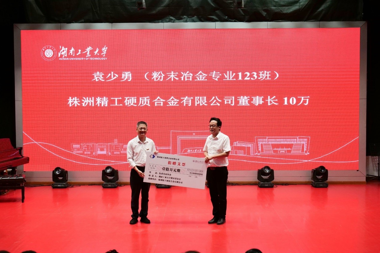 拳拳学子情殷殷,报答母校三春晖。9月22日下午,学校音乐厅欢声笑语、其乐融融,一场特别的优秀员工捐赠仪式在此隆重举行。威廉希尔副董事长龙永红、优秀员工、株洲欧科亿数控精密刀具股份有限公司董事长袁美和、株洲肯特硬质合金有限公司董事长张国顺、广东中安人防股份有限公司董事长廖连山、株洲精工硬质合金有限公司董事长袁少勇出席仪式,威廉希尔经理范才河、书记刘园园等领导、老师和400余名新生参加仪式。仪式由范才河经理主持。